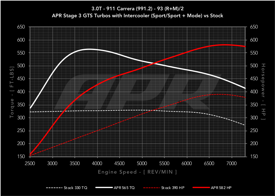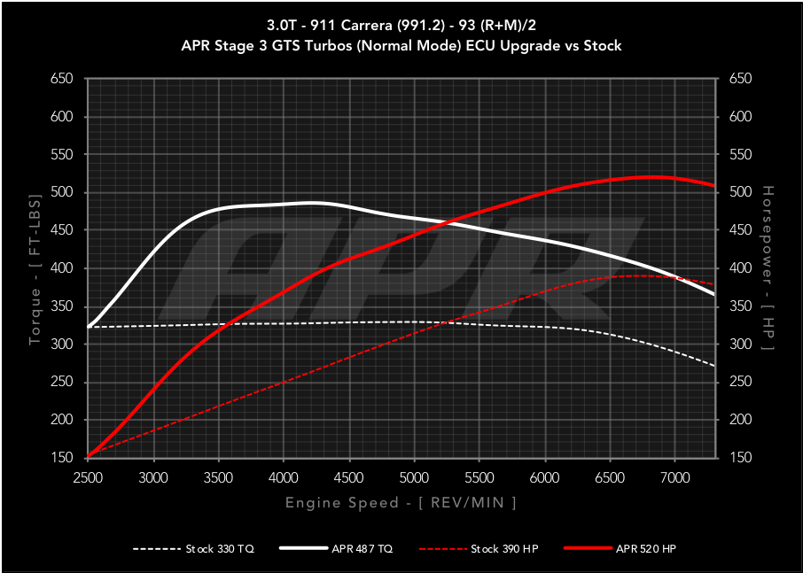 APR Stage 3 GTS ECU升級是進一步提高動力的下一步!此簡單升級僅需保時捷Carrera GTS原廠渦輪且無需其他引擎硬體改裝,即可產生520-615馬力,524-594 FT-LBS的扭力,具體取決於在整個功率範圍內,可獲得高達152-228 HP的馬力和196-266 FT-LBS的扭力。如果這樣還不夠, 那車主可以另外升級進氣,冷卻或排氣系統等來進一步釋放愛車的潛力!