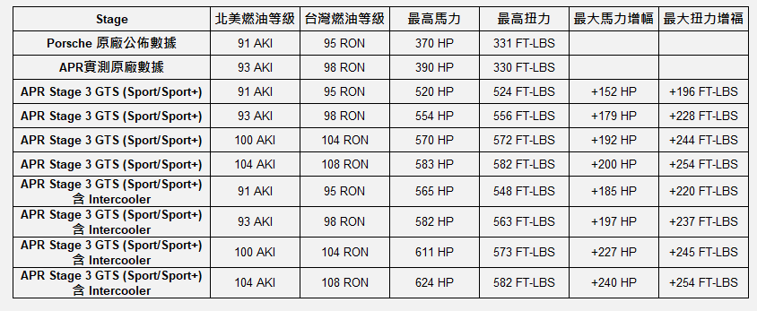 APR針對保時捷3.0T 引擎的Stage 3渦輪升級套件絕對是目前市面上CP值最高的改裝選擇! APR的電腦升級方案完美搭配原廠GTS渦輪系統和其編寫的電腦成, 採用最快速, 最安全的方式, 透過車輛OBDII插槽將APR美國總部工程師所編寫的電腦程式直接寫入車輛ECU, 此舉能有效, 明顯的提升您愛車的馬力和扭力,使其變得更加敏捷和令人振奮. 透過APR對原廠引擎管理系統的優化程序, 玩家可以充分感受到100%潛能釋放後的引擎效能!