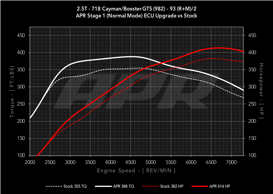 每次行車電腦升級都提供了除電源本身以外的許多改良。使用保時捷原廠的Normal,Sport和Sport Plus模式, APR 程式可提供不同級別的輸出並同時保留每種模式中存在的所有獨特特徵。運動和運動加模式可提供全部動力和扭矩。而在普通模式下, 只適當的增加引擎性能輸出, 著重於經濟性和舒適性。APR並優化了增壓,加油,點火,凸輪等功能,以在所有情況下實現更大的動力和扭力輸出。