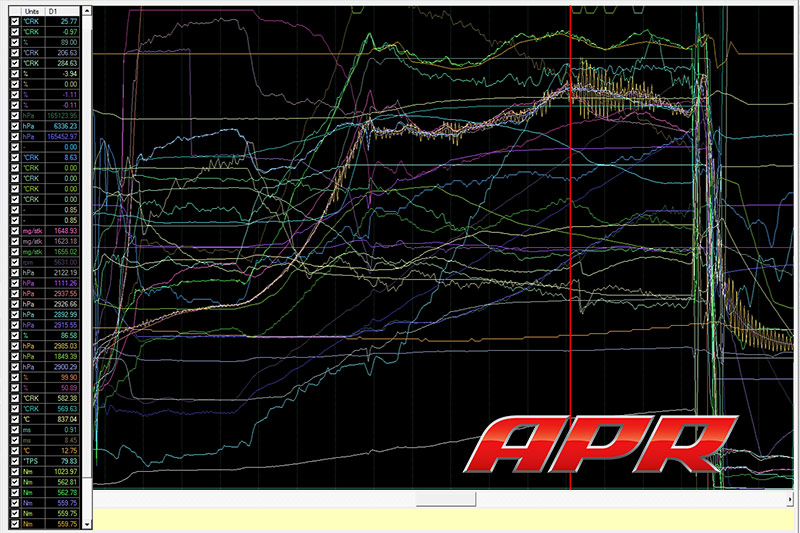 APR專有的ECU資源管理器使APR的校準工程師能夠隨時, 無限制的訪問車輛的整個引擎管理系統。大多數調諧器使用的典型商用數據記錄工具只能以極低的數據速率記錄最多12個引擎操作變數。這些工具還限於一小部分特定的變數。 APR的ECU資源管理器能夠以非常高的數據速率記錄ECU中發現的每個變數並且同時記錄。